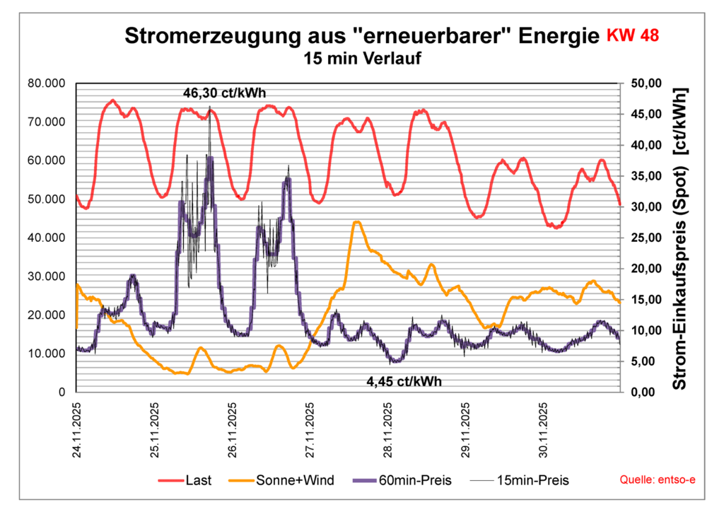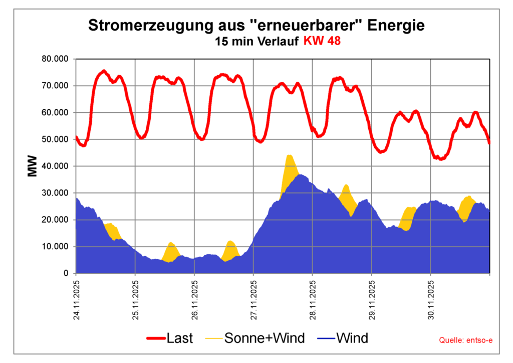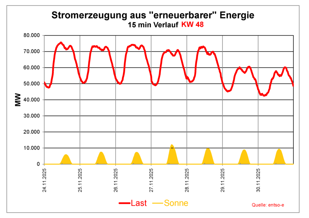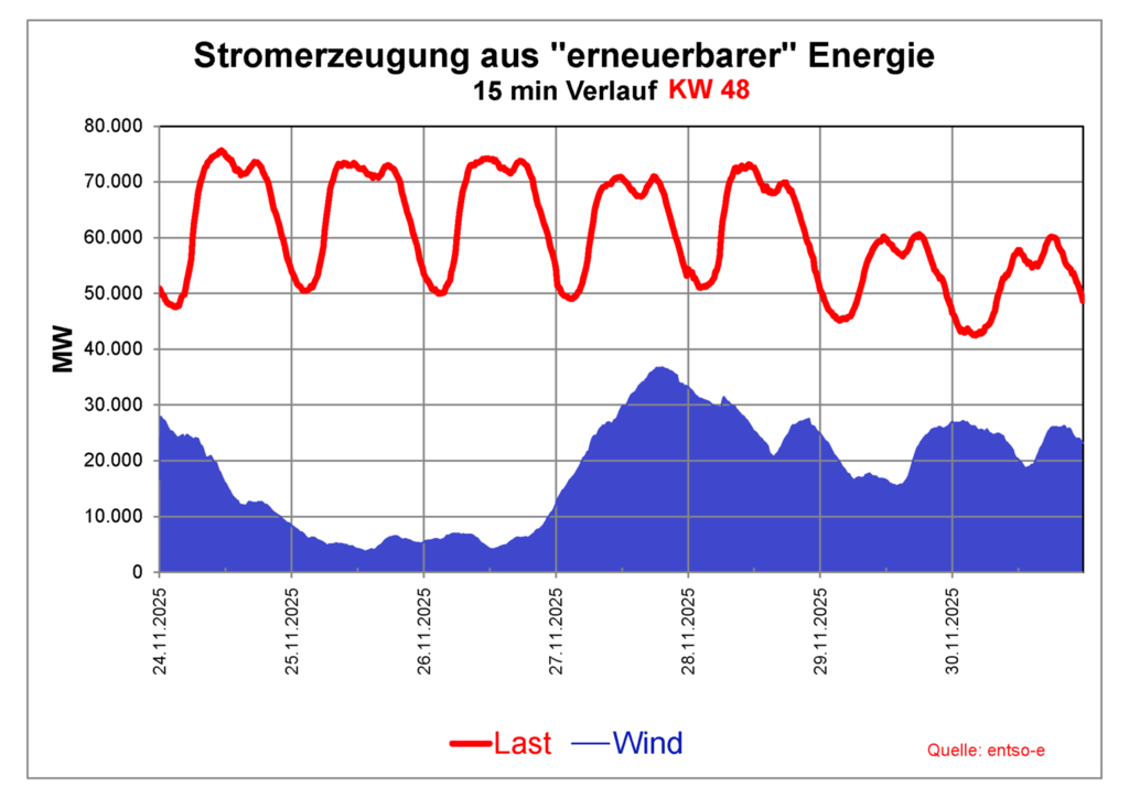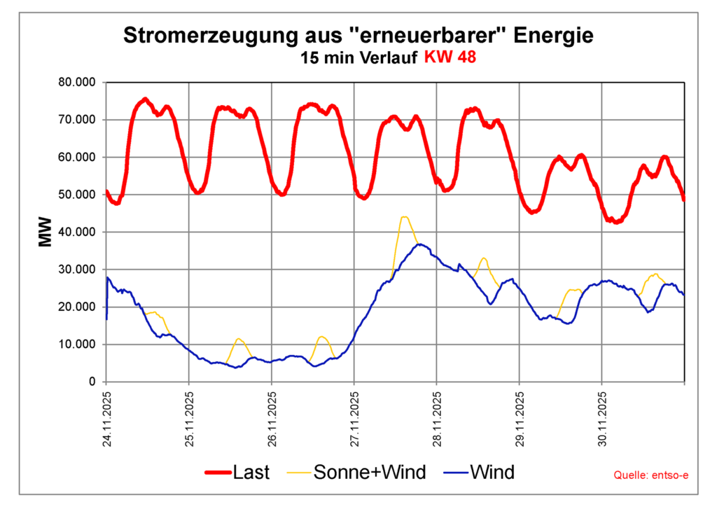 Die max. Last in dieser Woche betrug knapp 76 GW (ca. 7 % weniger als in 2019)