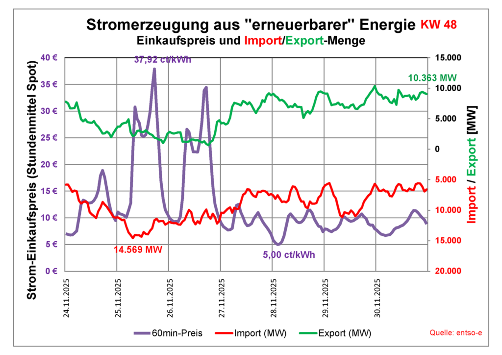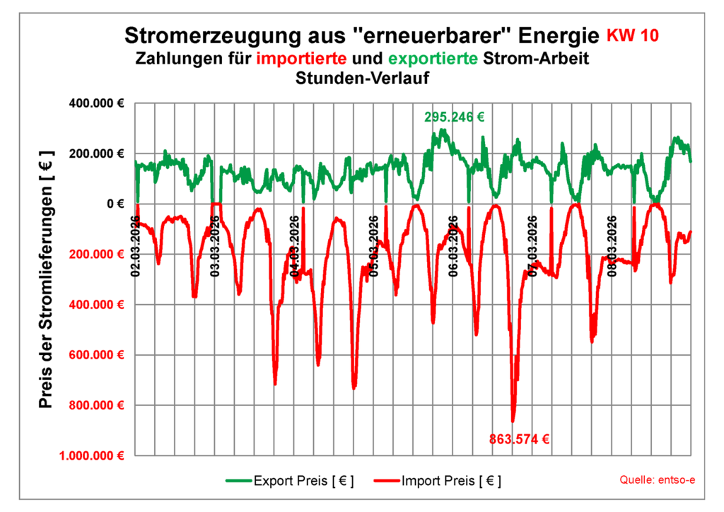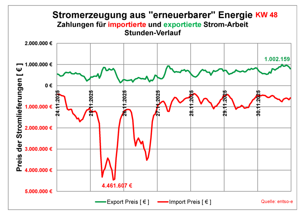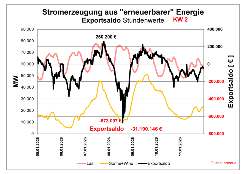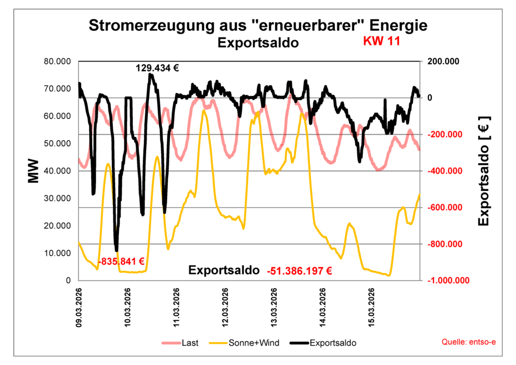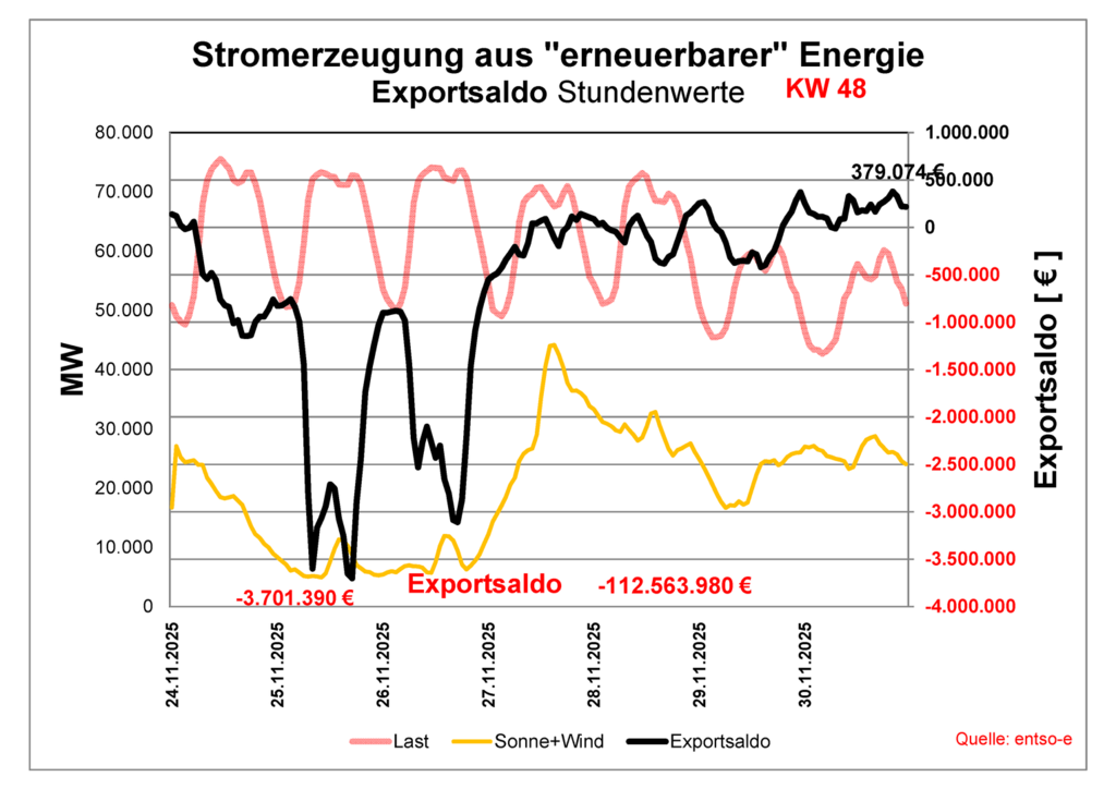 Wahrheit: Fast die Hälfte des produzierten Windstoms wurde mit negativem Verkaufspreis ins Ausland entsorgt. Konventionelle Kraftwerke sind unverzichtbar, damit Zappelstrom der Windräder ausgeglichen werden kann.