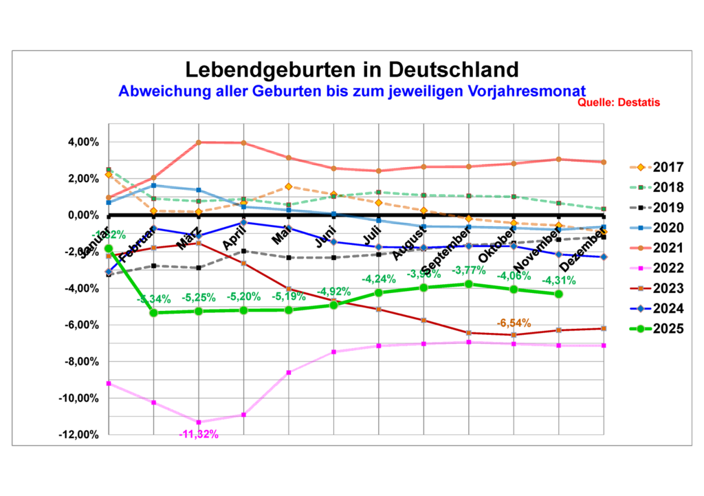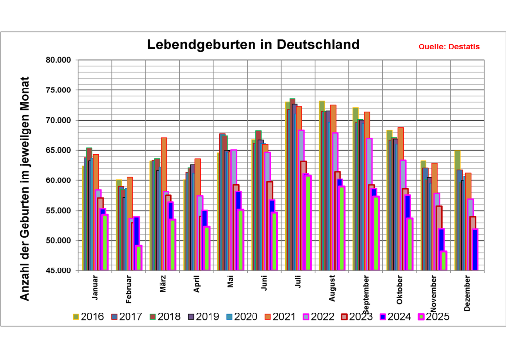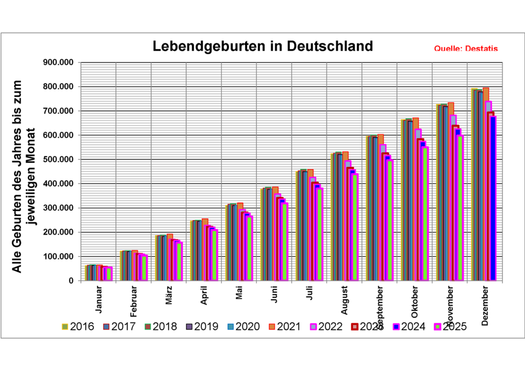 bisher 4,3 % (24.824) weniger Lebendgeburten als 2024